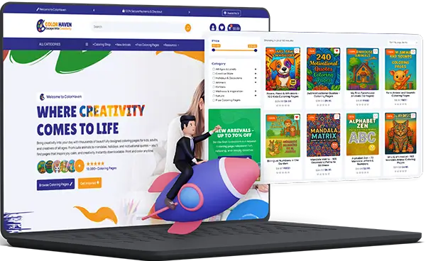With just a few clicks, you’ll have a complete, beautifully designed WordPress store preloaded with 10,000+ ready-to-sell coloring pages. No design or tech skills needed. Everything is included and ready to launch right out of the box.